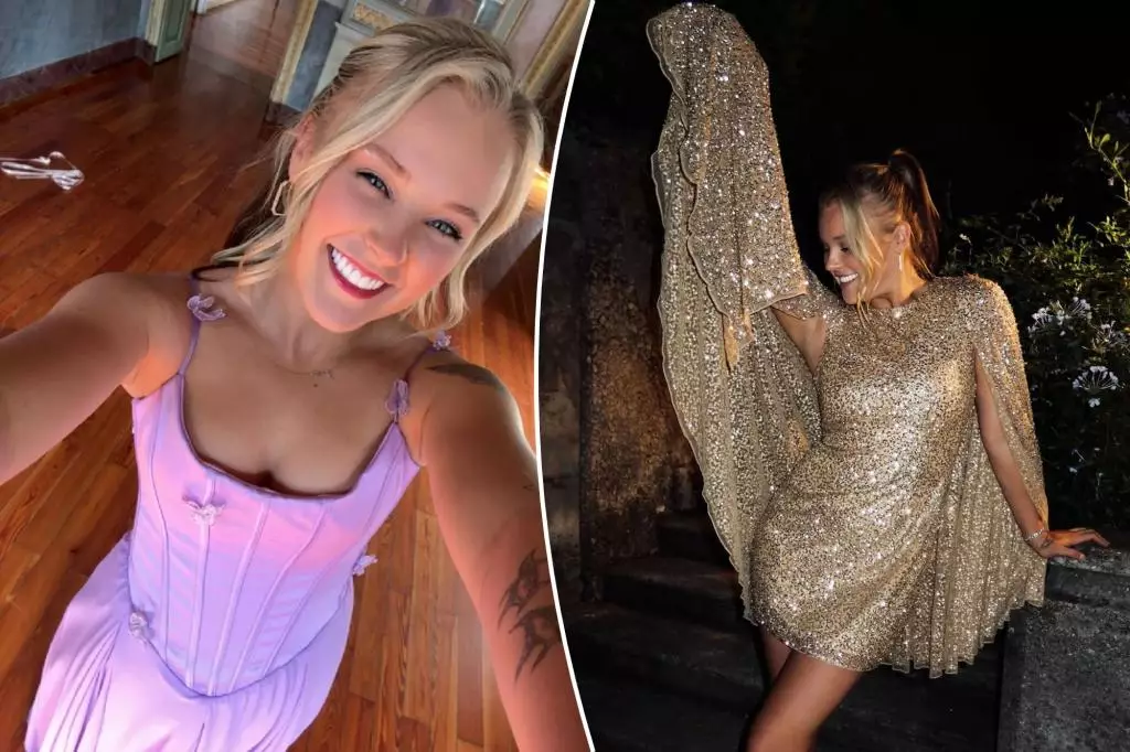 JoJo Siwa continues to prove that her star power extends far beyond childhood fame. Attending Kalani Hilliker’s wedding in Italy, the 22-year-old star dazzled in a stunning gold sequined cape dress that instantly commanded attention. Her choice of attire was not merely about fashion but a statement of confidence and individuality. With her arms wide